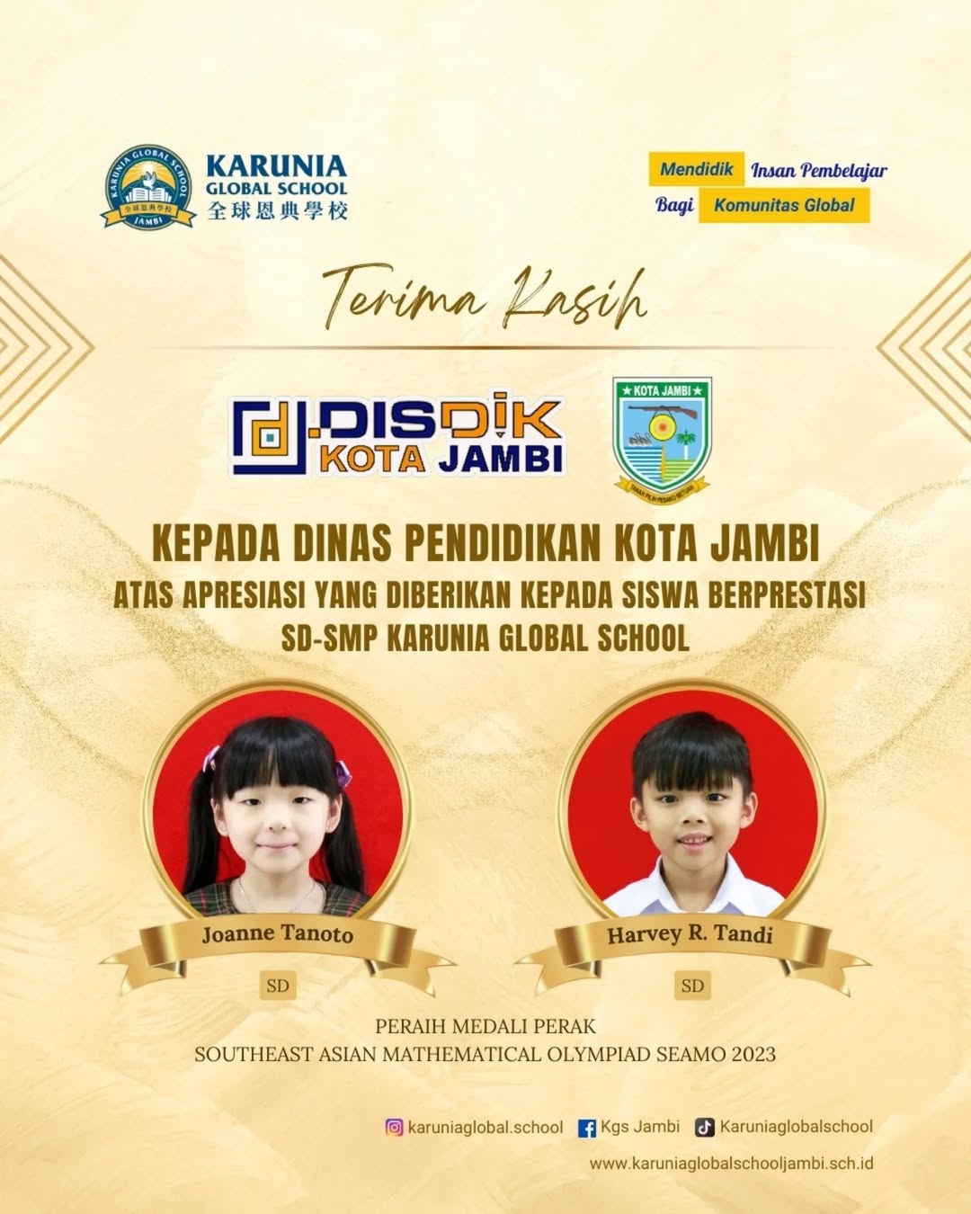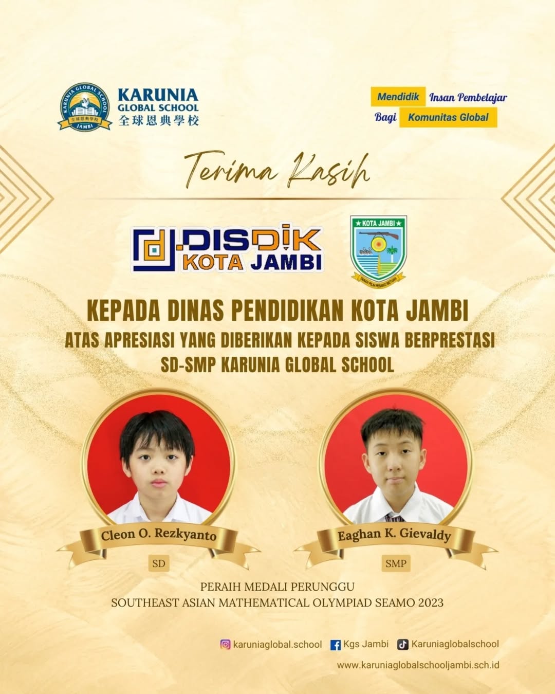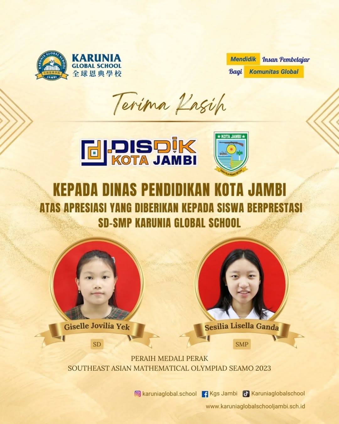 Terima kasih atas apresiasi yang diberikan oleh Dinas Pendidikan Kota Jambi kepada siswa berprestasi SD-SMP Karunia Global School.