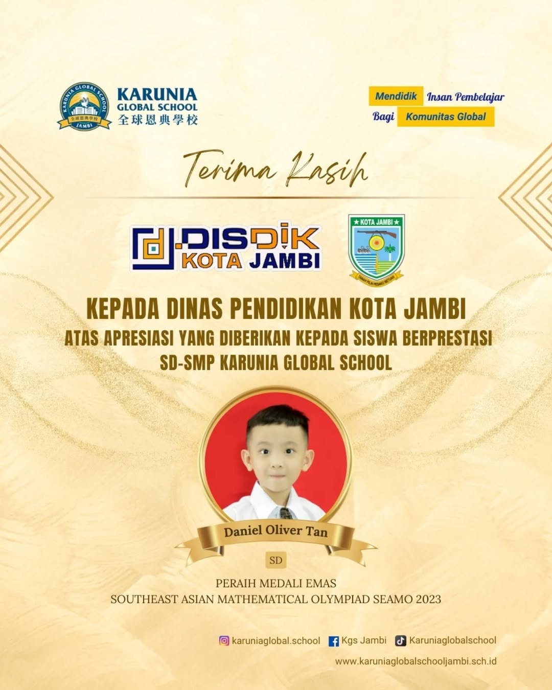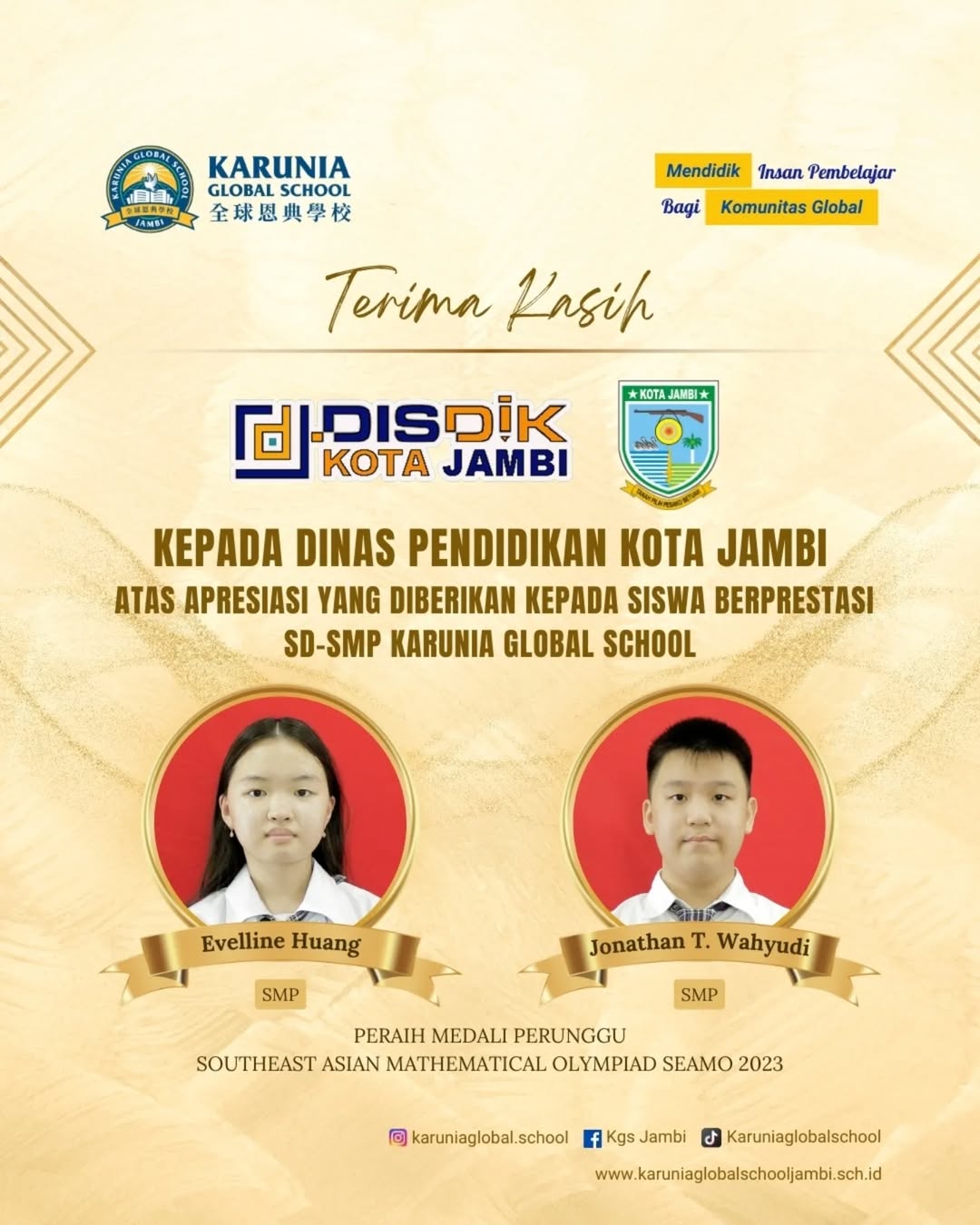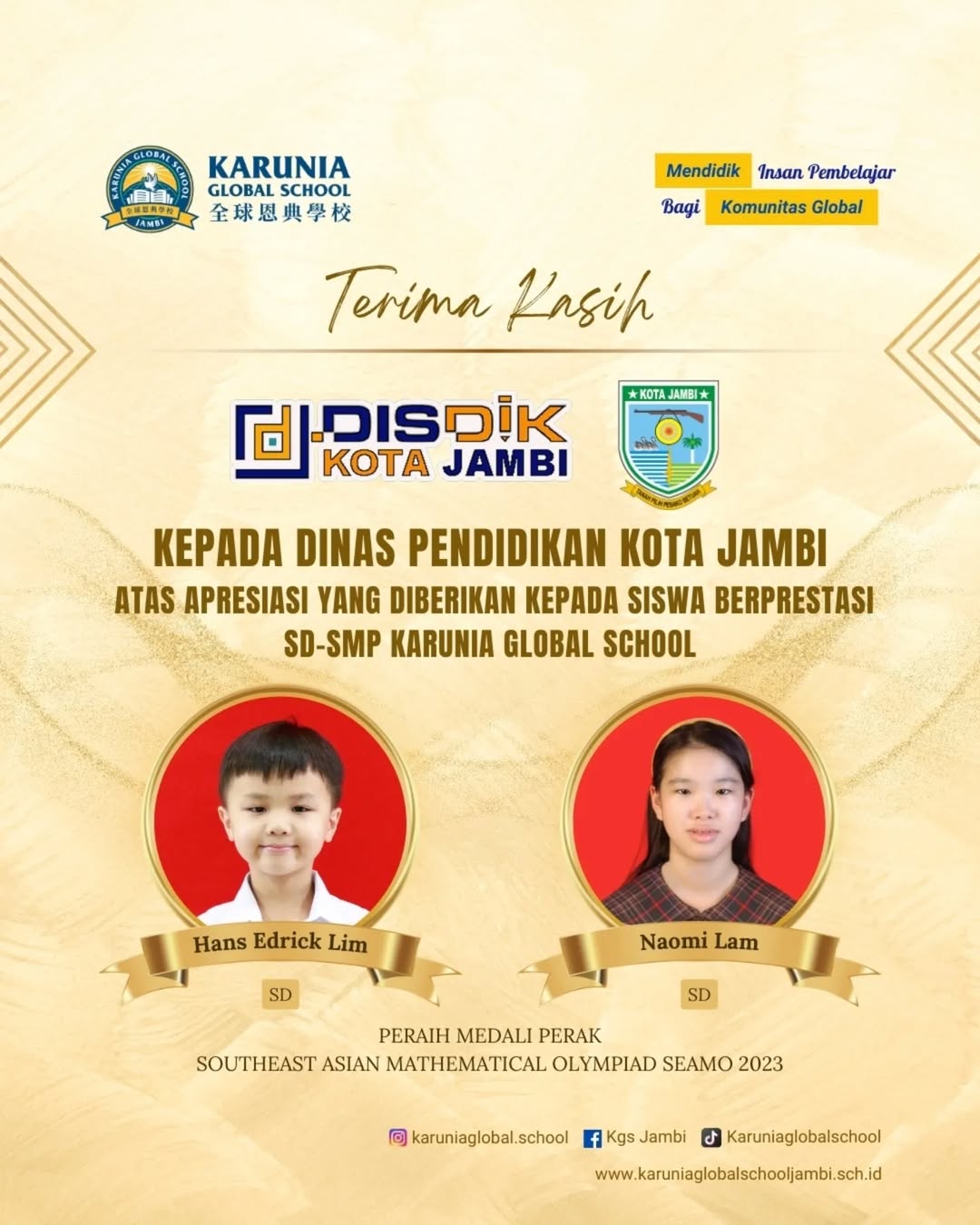 Terima kasih atas apresiasi yang diberikan oleh Dinas Pendidikan Kota Jambi kepada siswa berprestasi SD-SMP Karunia Global School.
