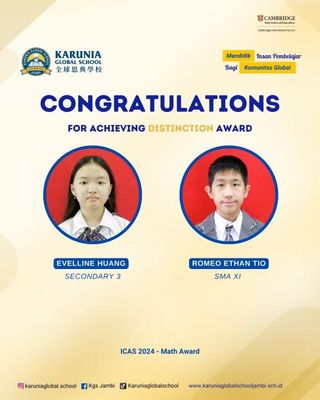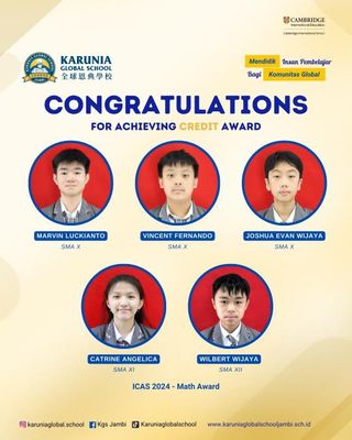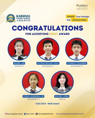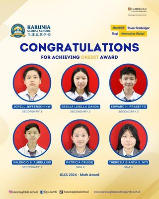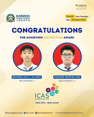 Selamat kepada para siswa SMP & SMA Karunia Global School yang telah mengukir prestasi pada ICAS Indonesia 2024 Assessment - Math Award!