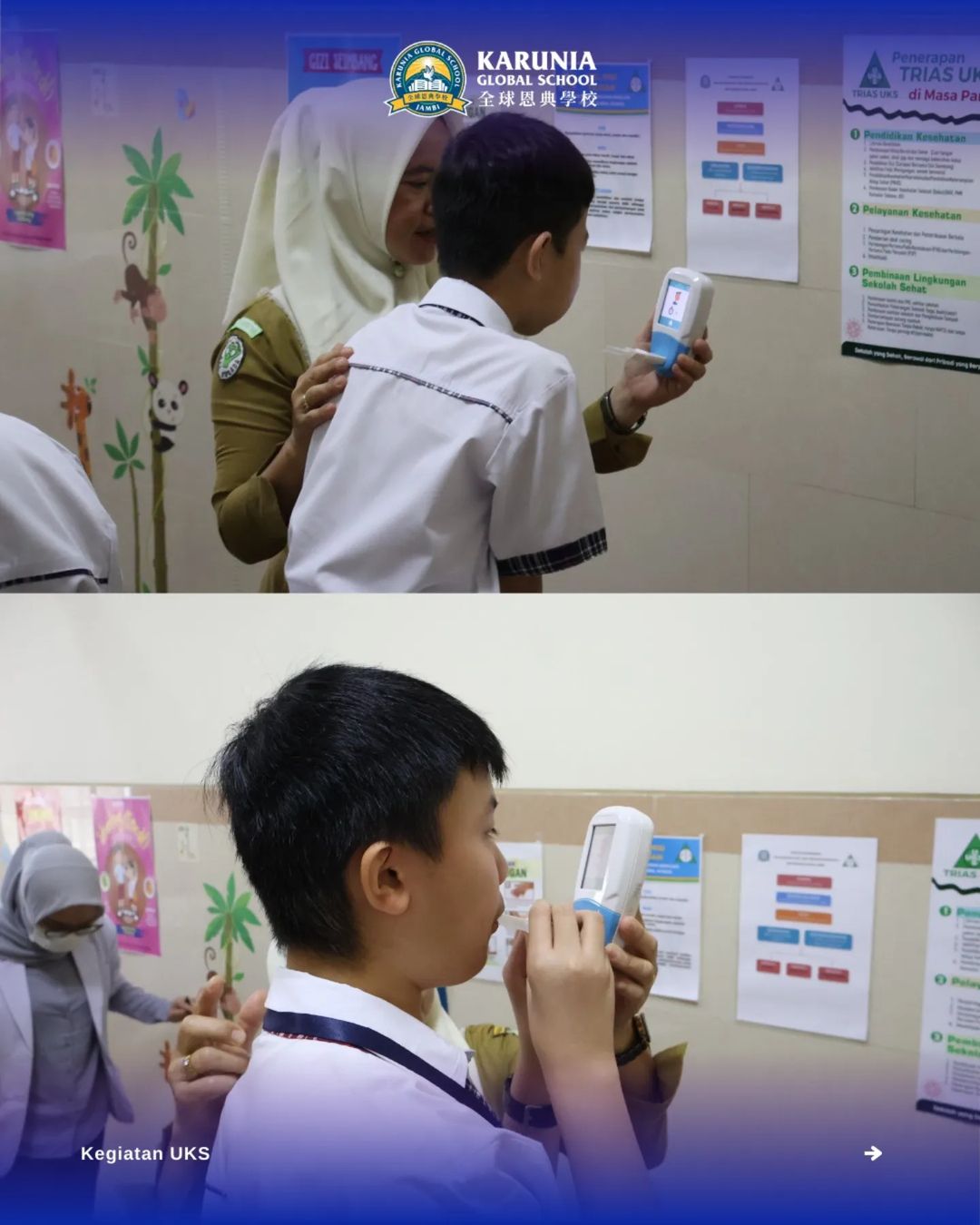 Karunia Global School bekerja sama dengan Puskesmas Kebun Handil untuk melaksanakan kegiatan UKS bagi siswa SMP & SMA KGS. Program ini mencakup berbagai pemeriksaan kesehatan, mulai dari penjaringan kesehatan, skrining kesehatan jiwa, pengecekan tekanan darah, kadar gula, dan kolesterol untuk siswa usia 15 tahun, serta upaya berhenti merokok melalui skrining UBM dan Smokelyzer. Selain itu, dilakukan juga pemeriksaan IKL (Inspeksi Kesehatan Lingkungan) untuk memastikan lingkungan sekolah tetap sehat dan aman bagi para siswa.