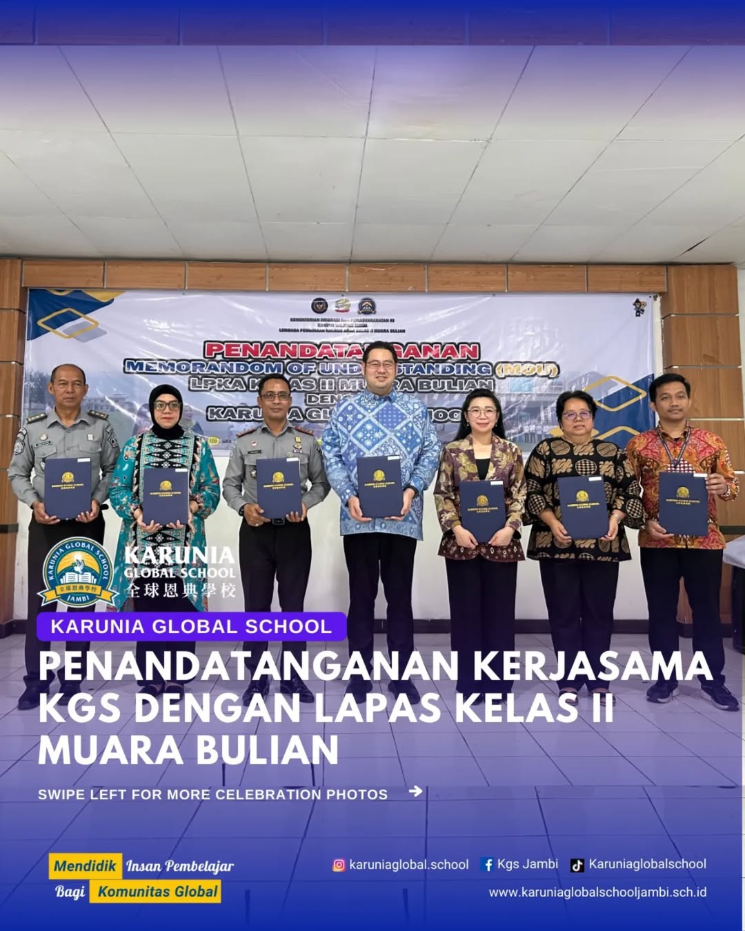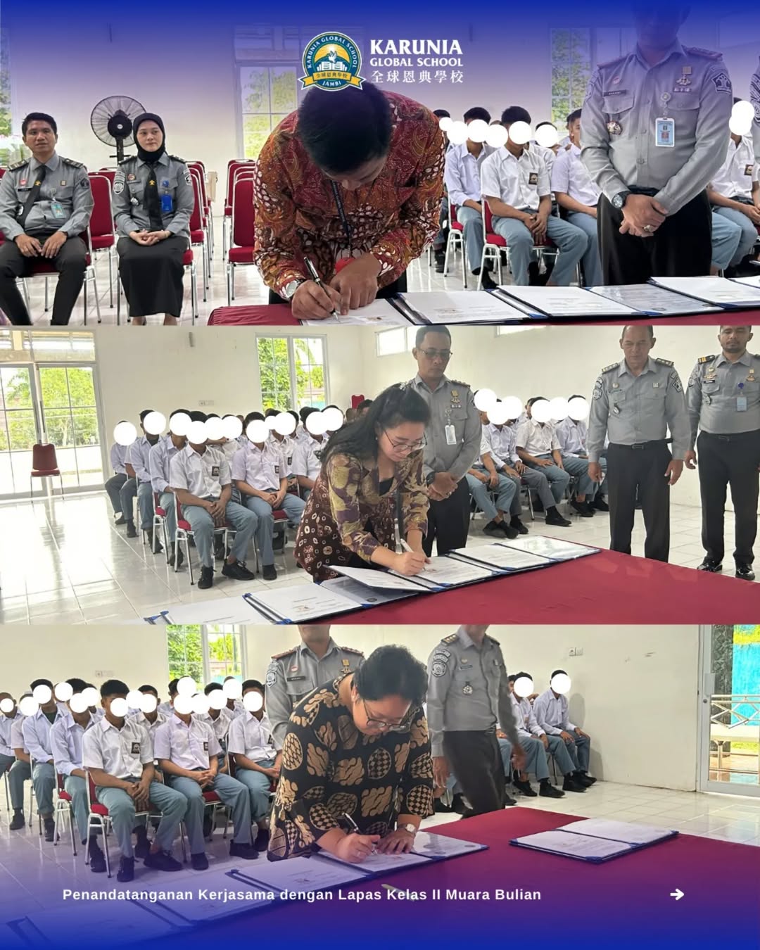 Penandatanganan MoU ini dilakukan langsung oleh Muhammad Askari Utomo (Kepala LPKA Kelas II Muara Bulian), Yustanti Limardi (Direktur Karunia Global School), Imelda Triana Sahelangi (Ketua Perkumpulan SPK Indonesia), Tristan Kusumawati Alexandra (Kepala Sekolah SD & SMP KGS), dan Toho Fervin M. Situmorang (Kepala Sekolah SMA KGS).